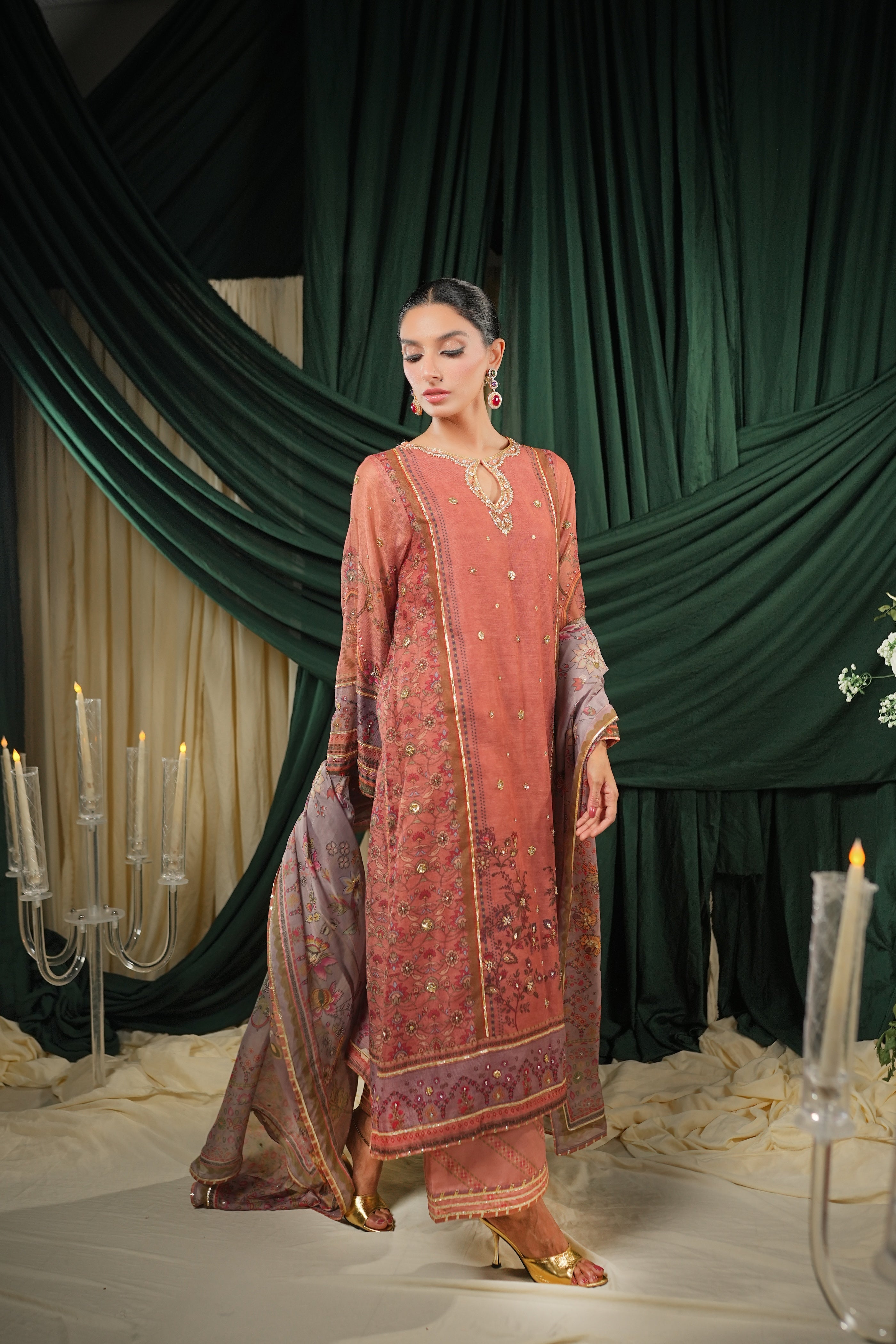 Earthy, warm, and richly detailed — Jashan merges tradition with modern refinement. The rust–mauve palette brings a regal depth, perfect for intimate, cultural gatherings under soft evening lights.