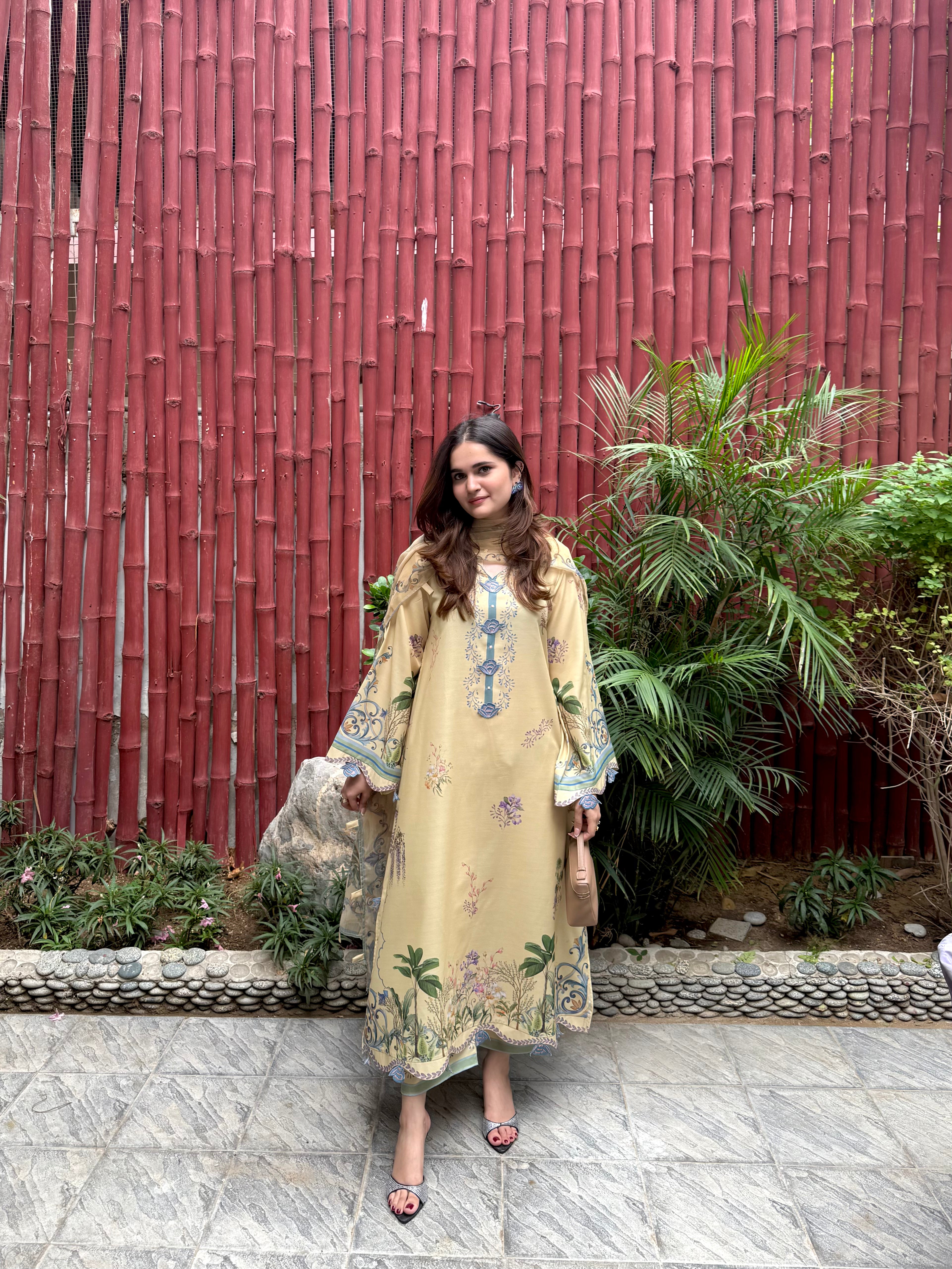 A warm butter-yellow base with intricate blue florals, glowing like golden daylight.
